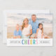 La tarjeta de fotos de vacaciones es sencilla y moderna y cuenta con una foto con una redacción de "Cheers" multicolor y un texto personalizado para un mensaje estacional, el nombre de su familia y el año. La parte posterior de la tarjeta incluye un patrón de rayas diagonales. Los colores alegres, perfectos para una foto de verano/vacaciones, incluyen azul cielo, verde menta, violeta, amarillo dorado, turquesa/azul verde azulado y rosa claro.