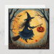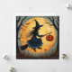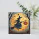 Tarjeta Festiva Bruja de Halloween en la habitación y luna llena