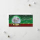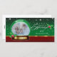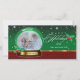 Buenas fiestas en fondo verde, las rayas rojas en terceros, añaden su foto dentro del globo de la nieve y su apellido. Accesorio de oro en el top y la parte inferior