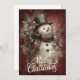 Comparte la alegría navideña clásica con esta tarjeta de Navidad festiva que presenta a un alegre muñeco de nieve vestido con un sombrero verde con banda roja y una acogedora bufanda de cuadros rojos y verdes. Rodeado de hojas de acebo y bayas contra un fondo rojo rico texturizado, el muñeco de nieve irradia espíritu navideño. La elegante letra cursiva blanca deletrea “Feliz Navidad”, lo que hace que esta tarjeta sea perfecta para enviar calidez, tradición y encanto atemporal.