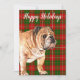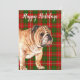 Tarjeta de vacaciones con ilustración de acuarela de adorable bulldog en fondo escocés festivo verde y rojo y saludo de vacaciones personalizable.