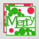 Feliz Navidad en estilo moderno retro. Burbujas o puntos rojos y verdes brillantes rodean la palabra Merry escrita a mano. El reverso presenta más puntos y un panel de mensaje que puedes personalizar con tu saludo: Feliz Navidad, Felices Fiestas o cualquier otra cosa que desees. Otras opciones de personalización incluyen espacio para el nombre de una familia o un breve mensaje y nombres individuales. Una versión moderna de una estética vintage. Brillante y audaz, pero también limpia y contemporánea. Esta es una tarjeta divertida y llamativa para cualquier saludo de fiestas.