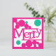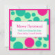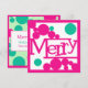 Feliz Navidad en estilo moderno retro. Burbujas o puntos rosados y verdes rodean la palabra Merry escrita a mano. El reverso presenta más puntos y un panel de mensaje que puedes personalizar con tu saludo: Feliz Navidad, Felices Fiestas o cualquier otra cosa que desees. Opciones de personalización adicionales incluyen espacio para el nombre de una familia o un breve mensaje y nombres individuales. Una versión moderna de una estética vintage. Brillante y audaz, pero también limpia y contemporánea. Esta es una tarjeta divertida y llamativa para cualquier saludo de fiestas.