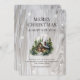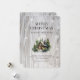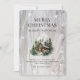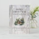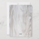 Tarjeta acuática de vacaciones con una cabaña de madera en el bosque, sobre un fondo rústico de madera decorado con copos de nieve. Personalice fácilmente esta tarjeta de vacaciones con su nombre y texto de familia.