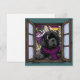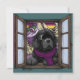 Hermoso perro Newfoundland dibujado y coloreado a mano presentado en un paisaje invernal mirando a través de una ventana nevada