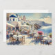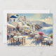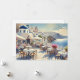 Perfecto regalo para los amantes del viaje y del café. El cuadro acuático representa el encanto tranquilo e idílico de una cafetería al aire libre de Santorini. El espacio está decorado con paredes encaladas con acentos azules y aberturas abovedadas que ofrecen unas vistas impresionantes al brillante mar Egeo. Mesas de madera con sillas de mimbre dispersas por todas partes, cada una de ellas adornada con jarrones de flores de buganvillas vibrantes. Un mostrador de piedra natural ofrece una cafetera tradicional griega, bollería y una cafetera espresso de época. En la parte superior, una pérgola de madera recubierta de viñas exuberantes ofrece una sombra parcial, lo que crea una luz solar dilatada en el suelo de baldosas de piedra. Los clientes se sientan con tranquilidad, tomando café y mirando al mar o conversando en silencio. Los icónicos colores blanco y azul de Santorini armonizan maravillosamente con la belleza natural del paisaje de los alrededores.