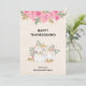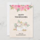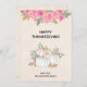 Tarjeta de Día de Acción de Gracias con calabazas blancas de acuarela elegante con acentos de brillo dorado falso. Rodeadas de hojas verdes y flores silvestres rosadas.