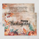 Celebre el Día de Acción de Gracias con nuestra tarjeta de vacaciones diseñada cuidadosamente, perfecta para expresar su gratitud y buenos deseos. La parte frontal de la tarjeta presenta un encantador arreglo de calabazas de otoño y hojas coloridas sobre un fondo de madera rústica, capturando la esencia acogedora de la temporada. La letra de estilo caligráfico elegante deletrea un mensaje festivo, agregando un toque de sofisticación al diseño. En el reverso, un sentido mensaje de Día de Acción de Gracias completa este significativo saludo, lo que lo convierte en una forma ideal de conectarse con seres queridos durante esta temporada de agradecimiento.