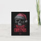 diseño gráfico audaz y desgastado que presenta una calavera muy detallada y dibujada a mano que está amenazadoramente coronada con un sombrero rojo de Santa deteriorado. La ilustración tiene una apariencia pesada, texturizada y ligeramente salpicada, sobre un fondo gris oscuro. Debajo de la calavera, las palabras "FELIZ NAVIDAD" se presentan en tipografía roja prominente y estilizada. Este diseño ofrece una visión única y alternativa de la temporada navideña.