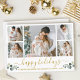 La caligrafía moderna Script Happy Holidays 5 Photo Holiday Card incluye hojas de eucalipto de color de agua. Texto dorado.