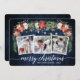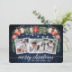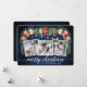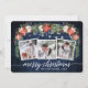 Moderno y elegante guión de caligrafía, acuarela floral de invierno, hilo de luces de cadena Pareja 3 Foto Tarjeta navideña de mora incluye poinsettias de color rojo acuarela, rosas blancas, bayas huecas, conos de pino y vegetación botánica. Madera Azul Rústica.