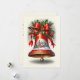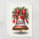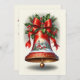 Una campana de Navidad ricamente decorada, completa con una exuberante cinta roja y ramitas de acebo, enmarca una pintoresca escena invernal de un pueblo. La iglesia y las casas cubiertas de nieve evocan una sensación de nostalgia, mientras que los copos de nieve que caen suavemente añaden un toque mágico a la atmósfera.