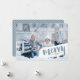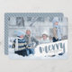 Un moderno saludo "alegre" es el centro de este diseño que incorpora texto con letras de pincel y un acento pintado para un aspecto contemporáneo único. Envíe un saludo memorable a la familia y amigos con esta tarjeta de foto que incluye una imagen de gran tamaño de su familia en la parte delantera y un patrón coordinado a rayas en la parte trasera todo en suaves tonos azules de invierno.