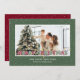 Tarjetas de Navidades de fotos personalizados retro rojas y verdes con luces de Navidad, caída de nieve y un título de tipografía con signo de marquesina. Personaliza fácilmente estas hermosas tarjetas de Navidades de fotos rojas y verdes con tu imagen y un nombre de familia.