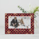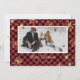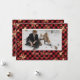 Hermosas tarjetas de Navidades de foto de doble cara de piel roja y manta de búfalo con brillantes copos de nieve y estrellas con un título de caligrafía y un marco fotográfico. Un texto personalizado con brillantes copos de nieve y estrellas en un fondo rojo de búfalo chapado al fondo.