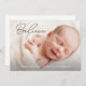 Difunde alegría por las vacaciones con esta tarjeta de foto de Navidad Believe Baby —una manera reconfortante de celebrar la temporada y mostrar a tu pequeño. El diseño presenta un elegante guión manuscrito, acompañado de la foto de su recién nacido, creando un conservadurismo atemporal que combina el encanto festivo con la simplicidad moderna. Personalice con su nombre y año familiar para que sea único suyo. Ya sea enviada a abuelos, amigos o seres queridos cercanos y lejanos, esta tarjeta captura la alegría, la inocencia y la magia de la primera Navidad del bebé. Perfecto para familias modernas que valoran el diseño elegante y los toques sentimentales, esta tarjeta de vacaciones personalizado es más que un saludo, es un recuerdo que será valorado en los años venideros.