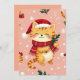 Seamless pattern of cartoon cat with red hats and scarves, sleeping and jumping, with mistletoe and snowflakes on a pink background