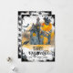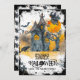 Esta tarjeta plana de Halloween muestra una casa embrujada con árboles espeluznantes, una bruja, murciélagos, un cuervo y una luna tonta y el texto 'FELIZ HALLOWEEN' en tipografía genial. Para agregar al tema espeluznante, también hay cruces grises. Hay un borde de grunge negro alrededor. La parte trasera incluye un patrón de bruja.