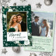 Estas hermosas tarjetas de vacaciones están diseñadas para una pareja que celebra sus primeras vacaciones como pareja casada. El diseño presenta su foto en un fondo de color esmeralda profundo rodeado de rosas pintadas a mano con acuarela en tonos de esmeralda, salvia y menta, junto con copos de nieve caprichosos y festivos. La leyenda dice "Casados y Brillantes" Felices Fiestas de los nuevos Sr. y Sra. La parte trasera tiene espacio para una segunda foto, así como una nota personalizada y firma. ¡Una forma maravillosa de enviar felicitaciones de Navidad, Janucá o vacaciones no específicas y fotos de boda al mismo tiempo!