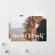 Esta sencilla y elegante tarjeta de Navidad para recién casados dice "Casados & Brillantes" en tipografía moderna de escritura a mano blanca con espacio para su nombre en la parte delantera, y un mensaje personal en la parte trasera. La tarjeta tiene espacio para dos de sus fotos de boda favoritas. La forma perfecta de enviar saludos navideños del nuevo Sr. y Sra.