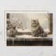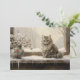 Tarjeta de saludo de vacaciones para navidades con un cuadro de un hermoso gato gris sentado en una ventana en un día de invierno nevado. Personalizado en la parte posterior con su mensaje y nombre. Comuníquese conmigo para obtener ayuda con su personalización o para solicitar productos adicionales de correspondencias o coordinación de Zazzle.