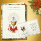 a radiant gold chalice bearing the Holy Eucharist beneath the words “Venite Adoremus – O Come Let Us Adore Him.” Surrounded by poinsettias and evergreens, the design beautifully proclaims the unity of the manger and the altar. Includes John 1:14: “And the Word became flesh and dwelt among us,” and a poetic interior verse invoking the peace and grace of Christ in the Blessed Sacrament. A reverent way to share the joy of the Nativity and the glory of the Holy Eucharist.