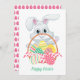 Tarjeta de vacaciones de la cesta de huevos de Pascua de Conejo Conejo Cute Easter . Un bonito conejo blanco mira la cesta de huevos. Patrón de huevo rosa de Pascua en la parte trasera.