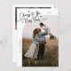 Modern New Year's photo template card featuring a hand written script text that says "cheers to the new year" with a curved frame picture. You can add another picture and a message on the back of the card. White and black.