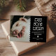 Buscando la tarjeta de vacaciones perfecta para mostrar a tu querido bebé peludo - ¡No busques más! Esta tarjeta de foto moderna y divertida hará sonreír a tus amigos y familiares. Personaliza la tarjeta con el nombre de tu mascota y tu apellido, junto con un mensaje festivo para una temporada de vacaciones feliz y saludable. El fondo negro se puede personalizar a cualquier color, y una dulce huella de pata con un corazón en el centro añade un toque extra de amor perruno. Comparte la alegría de tu amigo peludo con esta tarjeta de vacaciones 'Dog Gone Year'!