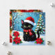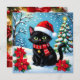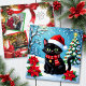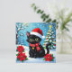 A personalized Christmas card with a front cover of an black cat sitting out in the snow with poinsettias and a Christmas tree and decorated collar. On the back you can add your own custom message, or leave the cute cat pun filled message, and add two photos in the personalize area.