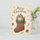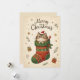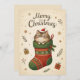 A festive illustration features a cute tabby cat wearing a Santa hat, nestled inside a green and red Christmas stocking. The stocking is decorated with traditional patterns. Above the cat, the words "Merry Christmas" are written in a decorative script. The background is a soft beige color, adorned with stars, dots, and sprigs of greenery.