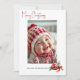 Christmas ornament with red bow and fir branches photo holiday card. It features a family photo, a red Christmas ornament with a red bow and branches of fir. There is a red border around it with white snowflakes. The back is covered with a pattern of white snowflakes on red background.