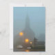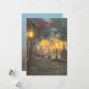 Una encantadora escena callejera con lámparas brillantes y comercios decorados, iluminada por la niebla de la noche, que crea un ambiente cálido y acogedor.