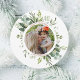 Navidades de texto de este personalizado | tarjeta de foto de círculo de vacaciones con eucalipto de color de agua pintado, hojas verdes e impresiones verdes sobre la parte posterior de las mantas de invierno. Envíe vítores de vacaciones a su familia y amigos.