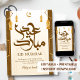 sophisticated Eid Mubarak card in cream and gold tones, featuring a layered arch design, intricate patterns, and realistic 3D golden lanterns.