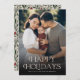 Estas elegantes tarjetas fotográficas de vacaciones cuentan con una plantilla de fotos con todo tipo de sangre, una elegante tipografía moderna que dice "Felices Fiestas" y un patrón floral dibujado a mano en la parte posterior con Navidades clásicos de color verde profundo, rojo burdeos y marfil sobre un fondo de arena/beige. Fácil de personalizar para hermosas tarjetas de vacaciones que cautivarán a toda tu familia y amigos.