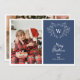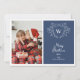 Difunde la alegría navideña con esta elegante y moderna tarjeta de felicitación navideña que presenta un diseño de muérdago de arte de línea blanca enmarcando un blasón clásico fácilmente personalizable con tus iniciales sobre un fondo azul clásico. Agrega uno de tus retratos familiares favoritos al lado izquierdo de esta tarjeta de vacaciones y un segundo en el reverso.