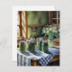 La luz del sol entra a través de las grandes ventanas de la cocina, las jarras iluminadas con verduras verdes y un jarrón de margaritas sobre una mesa cubierta de tela a cuadros azules y blancos. La cabaña de madera y la pared verde crean un ambiente rústico y acogedor en la cocina.