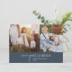 Este moderno collage de fotos azul marino de moda con noticias de año nuevo es el elegante saludo perfecto de vacaciones. Este sencillo diseño de boho presenta una caligrafía clásica sofisticada en un rústico azul marino oscuro y blanco. Personalice la tarjeta con 5 fotos (2 en la parte delantera y 3 en la parte trasera), su nombre de familia, nombres y año. Incluir un año opcional en revisión o boletín familiar en la parte posterior de la tarjeta.