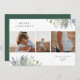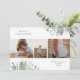 Bonito acuarela, decoración de invierno, tres tarjetas de vacaciones fotográficas. Características de la carta, vegetación de invierno en tonos suaves de azul y verde con respaldo de color verde cazador silencioso. La plantilla proporciona dos espacios para el texto del personalizado y tres fotos.