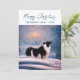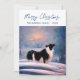 Collie de borde en la tarjeta de vacaciones de Navidades de paisajes nevados en invierno. Tranquilo paisaje de nieve de invierno con un precioso color de frontera blanco y negro. Feliz Navidad con un guión de moda. Tarjeta de vacaciones para el propietario de una red de borde. Puede cambiar el texto en la parte delantera y en la parte posterior o borrarlo.