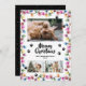 Modern black photo Meowy Christmas card featuring three photos and paw prints with multicolor Christmas lights on the front and a black snowy background at the back. Easily personalize this cute photo Christmas card with your photos, family name and the year.