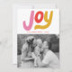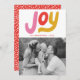 Audaz y moderna tarjeta de vacaciones con "Alegría" en letras rosas, rojas y doradas con tu foto familiar favorita que se muestra abajo. Personalice la parte delantera de la colorida tarjeta de vacaciones añadiendo su nombre y el año. La tarjeta de vacaciones con letras a mano se revierte para mostrar un patrón de puntos blancos contra un fondo rojo. Diseñado para coordinar con nuestra colección de tarjetas de Navidades Colorful Modern Joy.