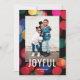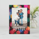 Esta moderna tarjeta fotográfica de vacaciones cuenta con un colorido fondo de bokeh (luces de vacaciones borrosas) con el saludo "JOYFUL" en blanco en la parte delantera. En la parte posterior se encuentra el mismo fondo de bokeh (que se puede eliminar si se desea). Personalizar este diseño añadiendo una foto y/o texto al fondo.