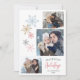 Esta moderna tarjeta de 4 Navidades fotográficos ofrece copos de nieve de colores en azul, oro, rosa y gris. El saludo "Festividades más felices" aparece en una combinación de texto curvo y manuscrito. Personaliza con tus fotos familiares, nombre y año.