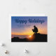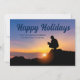 Un trabajador de la construcción se agacha frente a una hermosa puesta de sol en esta encantadora tarjeta de Felices Fiestas. Una tarjeta de Navidad personalizada y adorable para una empresa de construcción o constructora de viviendas.