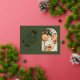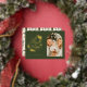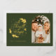 A modern dark green and gold foil religious holiday card. On the reverse is a pattern of green and navy holly and pine leaves. Personalize with your favorite photo and sign off.