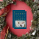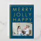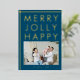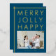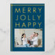 Tarjeta de Navidad moderna con foil dorado, Alegre, Feliz, Contento en fondo azul oscuro. Agregue su foto familiar y nombre.