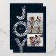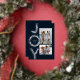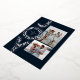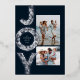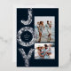 Una flor festividad JOY en Relieve metalizado plateado enmarca dos fotos en esta tarjeta única de Navidades. Perfecto para enviar saludos de vacaciones a la familia y amigos, cuenta con una foto vertical y horizontal sobre un rico fondo azul marino clásico. La parte trasera de la tarjeta es una moda que combina la armada con un patrón de nieve blanca coordinadora.