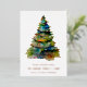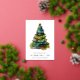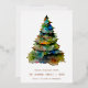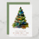 Árbol de Navidad acuarela Merry Jolly Feliz Relieve metalizado tarjeta de vacaciones. Felices, alegres, alegres deseos y tu apellido - agrega tu texto. El texto está en un verdadero Relieve metalizado de oro rosa. Dibujo artístico de acuarela de un colorido árbol de Navidad. Diseño festivo para tu tarjeta de Navidades. Personaliza la tarjeta con tu texto.